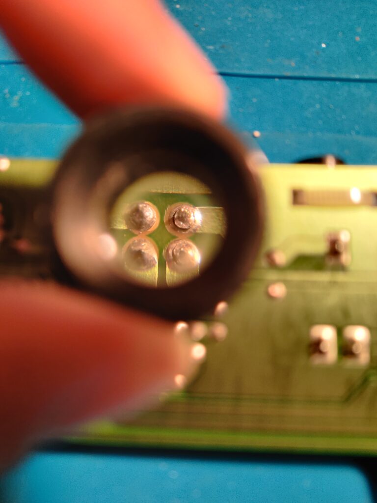 Il ne reste plus qu’a dévisser la carte pour pouvoir y jeter un œil. A l’œilleton on constate rapidement des fissures sur 2 des plots de la prise.